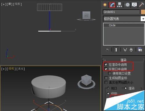 3、單擊“創建”-“圖形”-“樣條線”-“圓”按鈕,在“頂”視圖創建一個圓形,設置“半徑”為45;進入3DsMax2013“修改”命令面板,在“渲染”卷展欄下勾選“在渲染中啟用”和“在視口中啟用”復選框,設置“厚度為1.5,如圖所示。