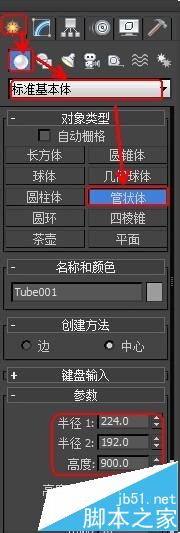 6、單擊“創(chuàng)建”-“幾何體”-“標準基本體”-“管狀體”按鈕,在“頂”視圖中創(chuàng)建管狀體,設置參數(shù)如圖所示。