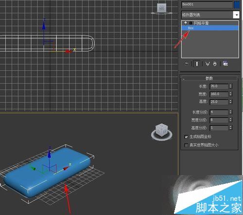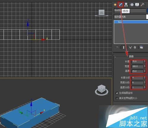 3、在命令面板中單擊“修改”,在下面參數(shù)里設(shè)長(zhǎng)方體的長(zhǎng):70,寬:160,高:25,長(zhǎng)度分段:4,寬度分段:8,高度分段:1。