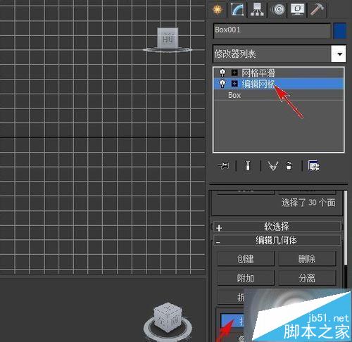10、在命令面板里選擇“編輯網(wǎng)格”,在“編輯幾何體”中單擊“擠出”,設(shè)置擠出值為“30”。