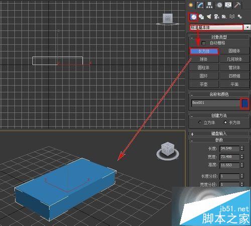 2、在右邊命令面板選擇“幾何體”,在下拉框里選擇“標(biāo)準(zhǔn)基本體”,選中“長(zhǎng)方體”,顏色設(shè)置為“蘭色”,在透視圖里創(chuàng)建一個(gè)基本長(zhǎng)方體。