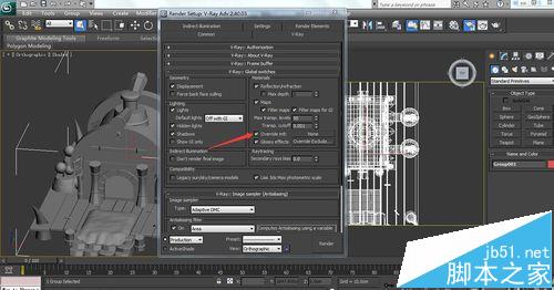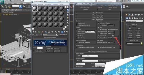 4、回到渲染面板,找到V-Ray選項下的全局開關global switches勾上override mtl。