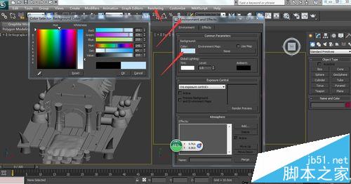 1、打開max場景后,第一件要做的事就是將場景背景色改為淡藍色或者白色。因為默認的背景色為黑色,不改顏色,渲染的東西被黑色填充,看不到任何物體。按快捷鍵8或者是找到菜單欄渲染rendering中下拉菜單第七項environment,將彈出的面板環境與影響environment of effect中顏色改為藍色或者白色。