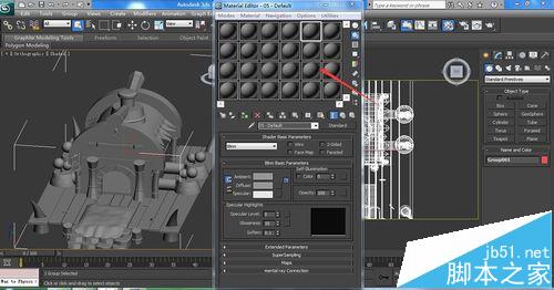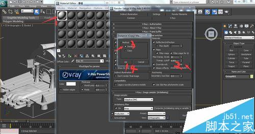 8、將材質附給場景中的物體,再把材質球拖到全局開關中打勾的override mtl后面的通道上。這時候會彈出關聯和復制材質球的提示,這里一定要選擇關聯instance,點擊ok,可以看到素模字樣出現在通道上。