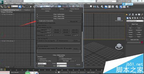 3、去V-Ray面板找到幀緩存frame buffer,將第一個勾去掉,所有都會變灰色。幀緩存是為測試參數而開,為測試圖而方便,如果成圖繼續開著影響渲染運行速率。