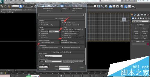 2、在全局開關global switches中把影響發射、貼圖、模糊影響均勾回來,再去掉不渲染最終圖像。勾回來指的是渲光子圖時reflection項、map項、gloss effect項均去掉的,并且勾上了不渲染最終圖像。