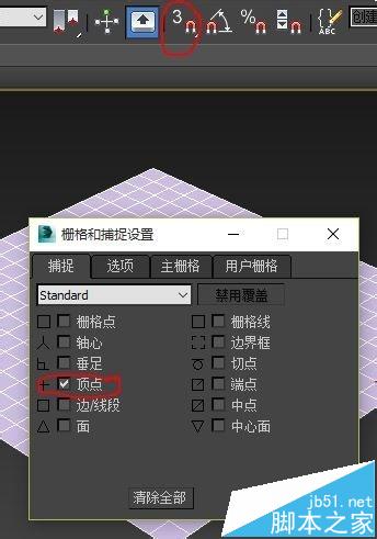 2、alt+w,最大化透視圖視口。右鍵(記住是右鍵,右鍵才能打開選項)捕捉開關,在“柵格和捕捉設置”中勾選“頂點”。設置完成后要記得選中捕捉。