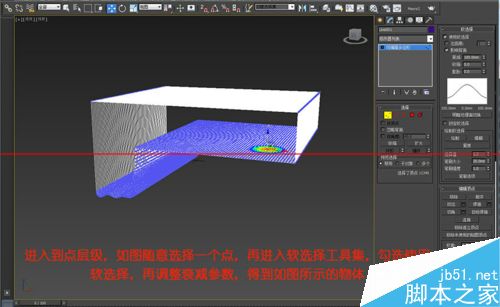 3、進入到點層級,如圖,隨意選擇一個點,再進入軟選擇工具欄,勾選使用軟選擇,再調整衰減參數,得到如圖所示的物體。