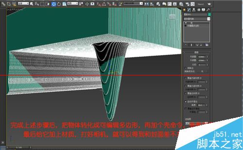8、完成上述步驟后,把物體轉化成可編輯多邊形,并給它加一個殼命令,參數如圖,再給他加個材質,打好相機渲染一下,就可以得到如封面差不多的效果圖了。