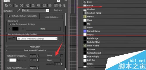 9、我們?cè)谔砑庸饩€跟蹤的時(shí)候下面有個(gè)選項(xiàng),如圖,就是環(huán)境反射的透明度,我們給這個(gè)選項(xiàng)添加一個(gè)衰減,falloff!