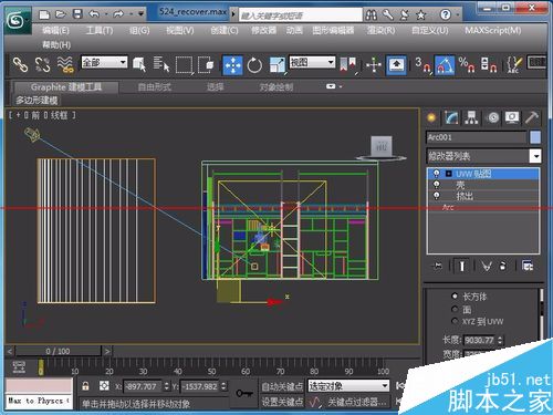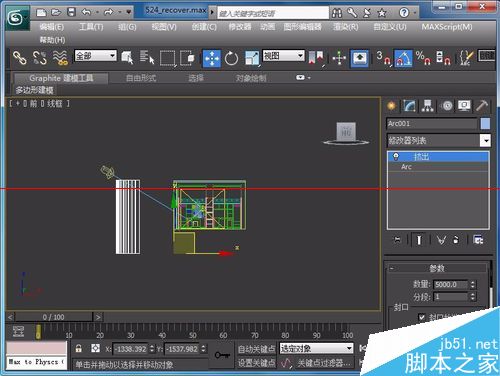 4、切換至前視圖,在修改面板里添加擠出修改器,并在參數(shù)面板中數(shù)量設(shè)為5000,調(diào)整位置,不要遮住目標(biāo)平行光。