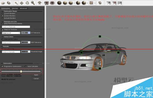 這時移動紅色方框內的滑輪,就可以減少模型面數了,只要模型不出現大的問題可以嘗試多減點面,達到自己想要的效果后點擊Apply。如圖: