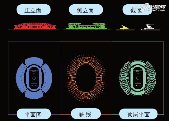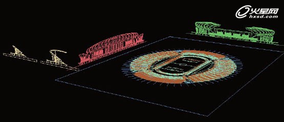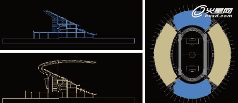 階梯觀眾席、中心體育場和遮雨棚幾個大結構。在建模之前,首先觀察CAD圖紙資料,分析該體育場的詳細結構。