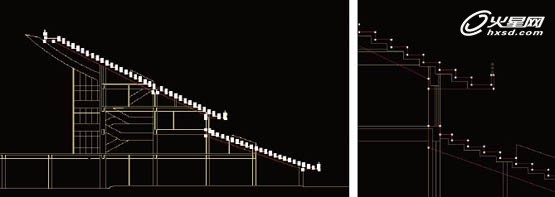 10.在3ds Max軟件中執行菜單[文件]|[導入]命令,選擇遮雨棚模型的dwg文件,即可將該模型導入到場景中,為該模型賦予基本材質,然后將模型成組,對照CAD圖紙進行復制,并調節模型角度,使其與圖紙對齊,如下圖(左)所示。先復制出1/4的遮雨棚模型,然后利用鏡像工具,復制出其他的模型,并使用[FFD晶格]修改器調節模型,使模型與圖紙完全對齊,如下圖(右)所示。