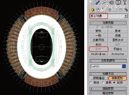 04.接下來進行[放樣]操作。選擇橢圓路徑圖形,然后在視圖中單擊拾取前面創建的觀眾席截面圖形,如下圖所示。