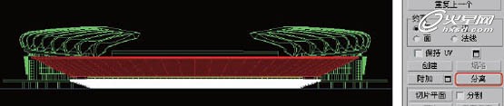 05.選擇放樣模型,單擊鼠標右鍵,在彈出的四元菜單中選擇[轉換為]|[轉換為可編輯多邊形]選項,在[元素]層級下,選擇上層觀眾席模型,單擊[分離]按鈕將其分離,如下