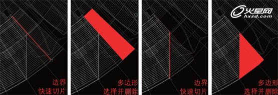08.選擇[可編輯多邊形]的[邊界]層級,單擊鼠標右鍵,在彈出的四元菜單中選擇[快速切片]選項,切出多余部分的邊界;然后進入[多邊形]層級,選擇切出的多邊形,按Delete鍵刪除,再次使用切片工具切出邊界,并將切出的多邊形刪除,如下圖所示。