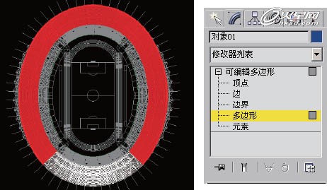 07.在[修改]面板的[修改器列表]欄中單擊鼠標右鍵,從彈出的菜單中選擇[塌陷全部],塌陷FFD晶格修改器,然后進入[多邊形]層級,選擇看臺以外的多邊形并將其刪除,如下圖所示。