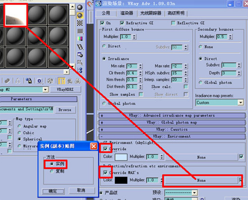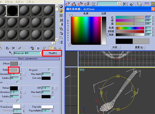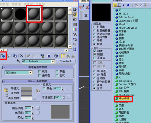 1、調節反射~~越暗反射越小,給物體材質~~~2、另選一材質球,點獲取材質按鈕,選VRAYNDRI~~