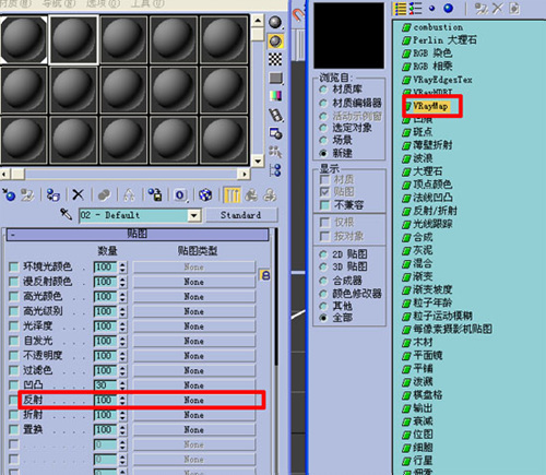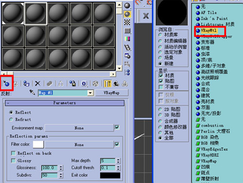 1、打開材質面板~~在反射通道給一個VRAY貼圖~~~2點擊獲取材質按鈕,點擊VRAYMTL材質~~