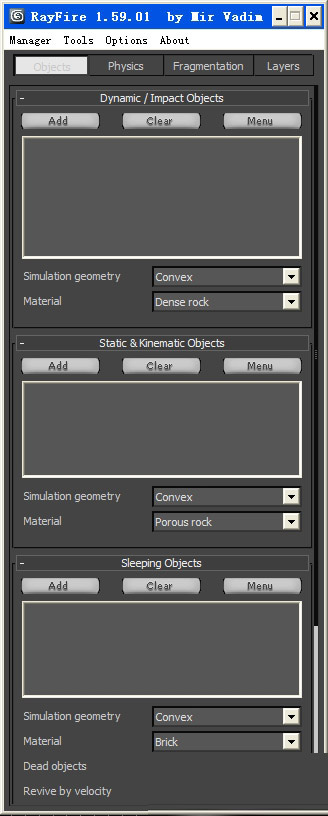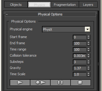 僅從字面上就不難理解:Dynamic/Impact Objects是主動(dòng)發(fā)生運(yùn)動(dòng)的物體,Static&Kinematic Objects是不會(huì)發(fā)生運(yùn)動(dòng)的物體,Sleeping Objects是處于睡眠狀態(tài)、在受到外力撞擊才會(huì)發(fā)生運(yùn)動(dòng)的物體。Fragmentation Options是物體的破碎級(jí)別,數(shù)值越大產(chǎn)生的碎片越多,Physical Options是物理模擬。