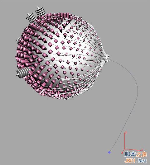 8、頂部的豆莢,我先創(chuàng)建了一個多邊形球體。把線條復(fù)制到球體的每一個頂點,然后使用Noise和Bounding四邊形功能調(diào)整規(guī)模。然后我用一個polywire使球體變細,我還創(chuàng)建了一些額外的細節(jié)模型,在球體的表面隨機復(fù)制添加(圖08)。