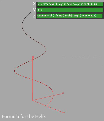 1、我創(chuàng)建了一個中心曲線。想法是創(chuàng)建一個基本的曲線,然后把整棵樹環(huán)繞這個曲線就行扭曲。為了做這個我先從制作一條直線開始,使用一個Point SOP和basic Sin,用Cos functions把這條直線轉(zhuǎn)換成一個螺旋線(圖02)。