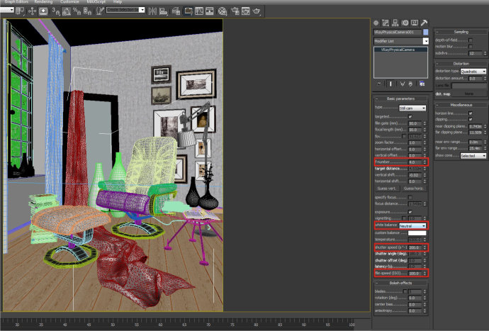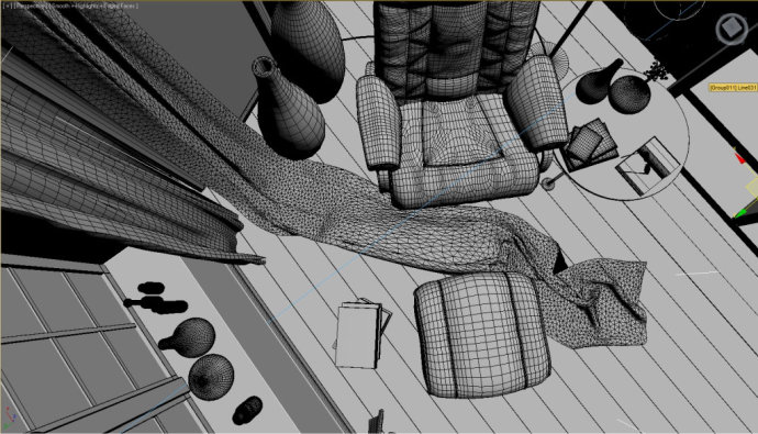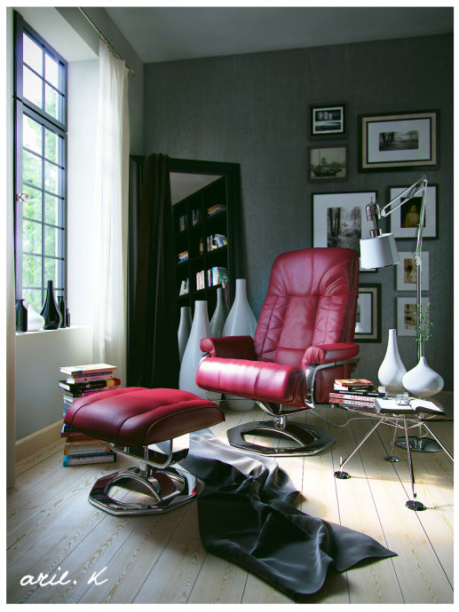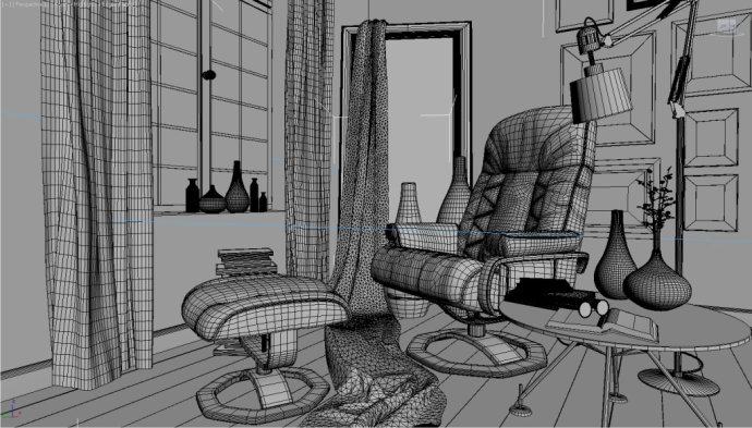 In this scene I used ready made models for accessaries, so I just modeled the wall, floor, window object using basic edit poly. And I created a simple decorative cloth model in Clo3d 2011.· 場景里基本使用的都是外部引入的家具擺設模型,只需要建門窗地板,然后要提到的是用Clo3d 2011(三維服裝軟件)做了個簡單的衣服模型。