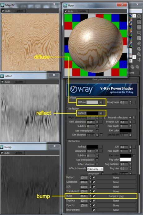 There are a lot of advanced materials that I use in the simple scene. I only use standard method color selector to set the diffuse and reflect properties.· 在這個簡單的場景里有很多高級材質設置,在反射上只用到了基本的方法,沒什么特別的。Wood floor · 地板