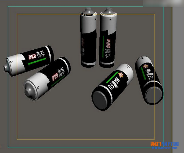而遮罩的設置只須直接將遮罩圖貼入通道就可以了,這里就不說明了。對場景中的所有電池賦予所設定的材質,場景顯示效果如圖22-9所示。如果你設定的效果與圖示不一樣,只需要對電池的2號選區施加一個UVW Map貼圖坐標修改器就可以了,具體參數請大家自己獨立完成。