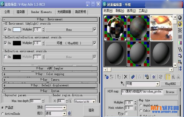 答案很簡單,一個是測試渲染的參數我設的很低,因此質量較差,但最根本的原因大家應該都能猜到,那就是還缺少一個環境貼圖的反折射烘托。因此我們決定最終在渲染面板中設置一個反射折射環境,貼圖類型選擇為VRayHDRI貼圖,參數設置結果如