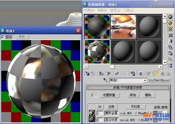 (2)將電池的材質類型設為多維子材質,設置ID號的數量為2個。將一號調節為磨砂金屬材質,而將2號暫時設定為一個Blend材質,待會有待細調。材質設定效果如圖所示。