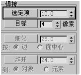 6、利用頂點級別的焊接選項組中的選定項按鈕,將焊接范圍加到10左右,如圖7所示,對節點進行焊接。