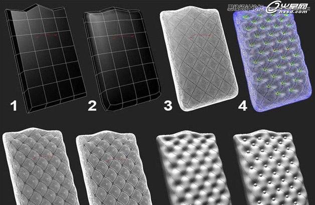 在這里我只解釋沙發椅的靠背部分。基礎模型是方盒子。先把大致外形確定好。然后進行一次圓滑處理。接著使用棋盤變形器。確定好邊緣線。強度為25、重復次數為3。