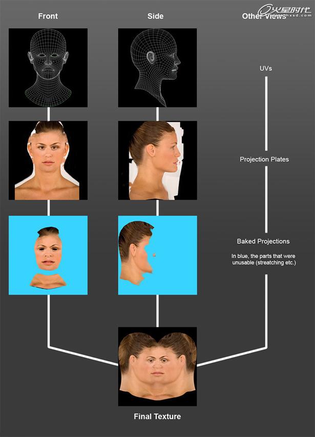 對于貼圖的處理,我用了一張幾年前在3d.sk上買的一張照片。我決定嘗試貼圖映射技術來制作頭部貼圖。先讓我簡單的說明一下如何使用貼圖映射,但是我不知道它(如果你會的話請隨時聯系我!)所以我真的有點不知道它如何產生結果的。我使用了一個展UV的小軟件,對它的4個視圖進行了展UV。然后我進入到Photoshop中對照著照片把每一層UV進行組合。直到我有一個完整的頭部貼圖。再回到3ds Max中進行貼圖烘焙。然后再回到Photoshop中把這些烘焙的結果進行組合制作出最終的貼圖。做了這么多似乎讓人有些痛苦,但這是我發現防止貼圖拉伸的最簡單的方法。