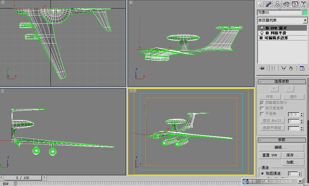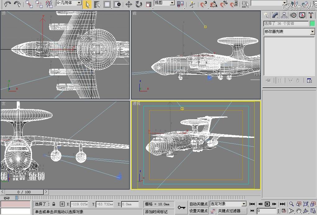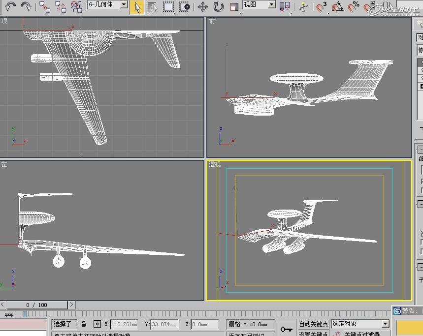 首先,打開一個(gè)練習(xí)場景“空中預(yù)警機(jī)1.max”(這事小弟平時(shí)的練習(xí)做的不好獻(xiàn)丑了)。(圖01)