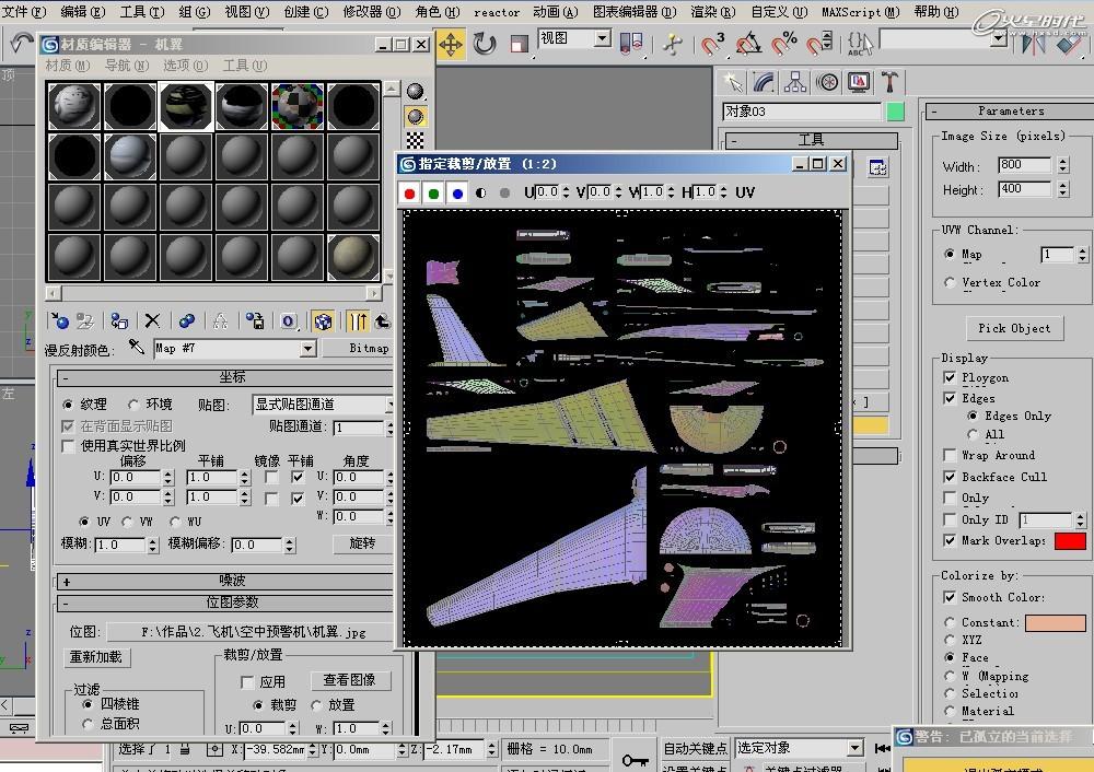 之后,我們打開max材質(zhì)編輯器。將機(jī)翼的材質(zhì)打開。給“漫反射顏色”選項(xiàng)一個(gè)貼圖。貼圖為剛才導(dǎo)出的uvw展開貼圖。(圖11)
