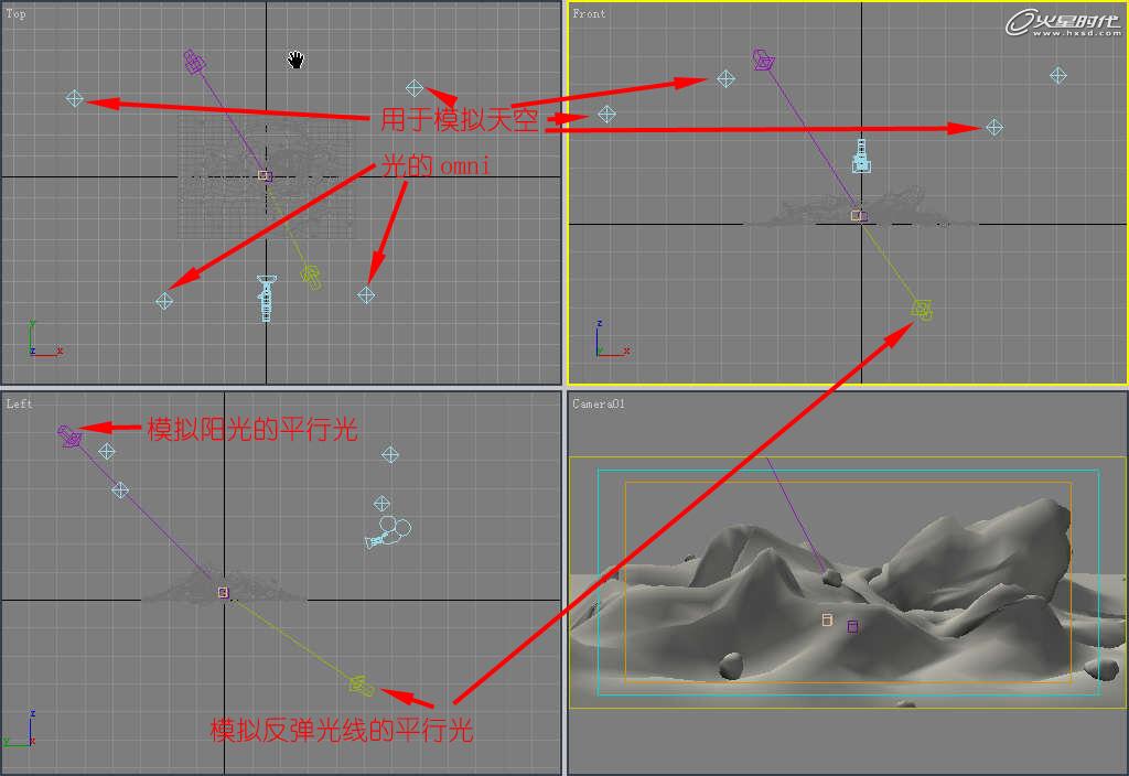 在本場景中,我們用四盞omni來模擬天空光。這是要一點技巧的工作,但是,如果你很不愿意手調(diào)的話,用一個半球形的燈光陣列就可以了,燈越多,效果越均勻,但是計算時間越多(但比起變態(tài)的GI計算,這個幾乎可以說是不花時間)。有四項需要注意: