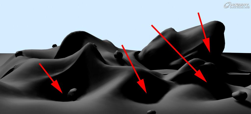 圖3中標(biāo)出的地方就是為什么這個圖看起來失真的第一個原因:在現(xiàn)實生活中,物體的背面不可能是這樣深的一致的黑色,一方面,來自周圍物體的光線會反彈到這些暗的區(qū)域,另一方面,在戶外場景中,真實的情況是,陽光進(jìn)入大氣層后,會出現(xiàn)散射的情況,這樣,在所有的戶外場景中,都有天空光的存在。天空光是一種方向隨機(jī)的光線,在max中提供了Light Tracer這樣的插件進(jìn)行模擬。而高級渲染器則幾乎都提供了這樣的天空光模擬。這個場景只是使得正對面的表面被照亮,更接近于在月球等沒有大氣散射的星球上的情況。關(guān)于光線行為的知識,建議新手們找本書研究一下,其實高級渲染器的說明文件也是不錯的。