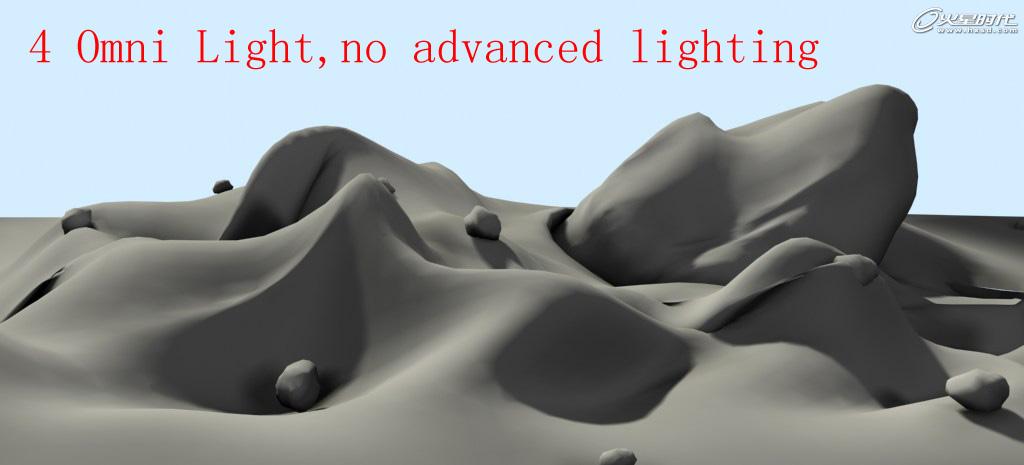 2. 燈光的放置,如前所述,如果你利用了很多的燈,這個就不重要了,但是如果像這里只用很少的燈,注意他們的擺放位置。 方法很簡單,關(guān)掉主光源,移動各個燈,直到整個場景中的物體邊緣看起來都被均勻照明就可以了。
