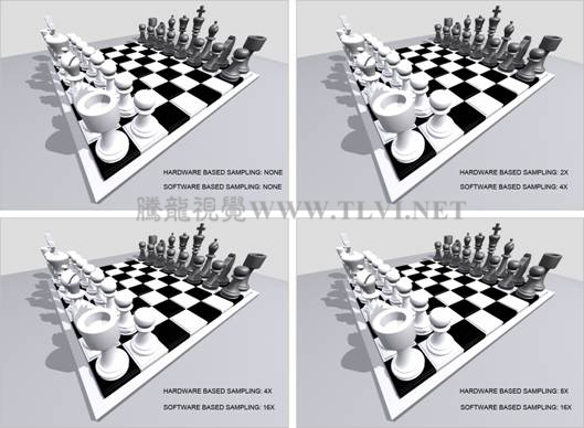 6. Renderer面板內的Hardware Based Sampling下拉式和Software Based Sampling下拉式選項欄內的選項分別基于硬件和軟件進行設置,決定了渲染的最終效果。Hardware Based Sampling下拉式內的參數基于邊界取樣,該選項欄內有None、2x、4x、8x四個選項,默認為None選項。選擇2x、4x、8x選項后,渲染效果依次更為精致。