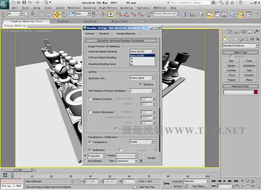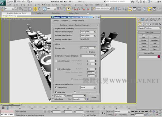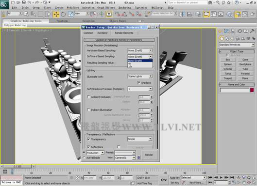 1. Quicksilver Hardware Renderer渲染方式在3ds max 2011中,新增了Quicksilver Hardware Renderer渲染方式,該渲染方式能夠根據實際的需要設置渲染的復雜程度,渲染效果相對粗糙,渲染耗費的時間也就越短;渲染效果較為精致,渲染耗費的時間就越長,當用戶渲染復雜場景時,能夠在短時間內得到渲染效果,在測試渲染階段節省了大量時間。