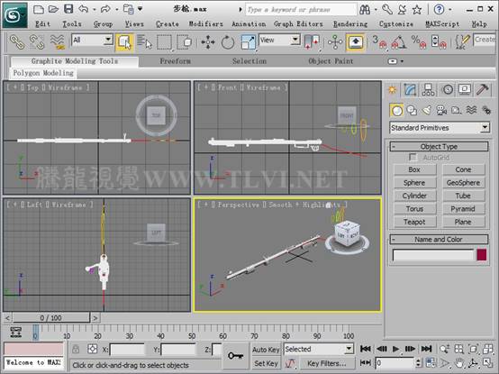(1)運行3ds max 2011,打開素材“步槍.max”文件。