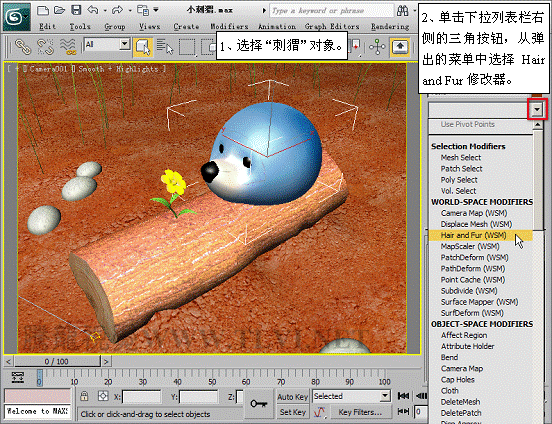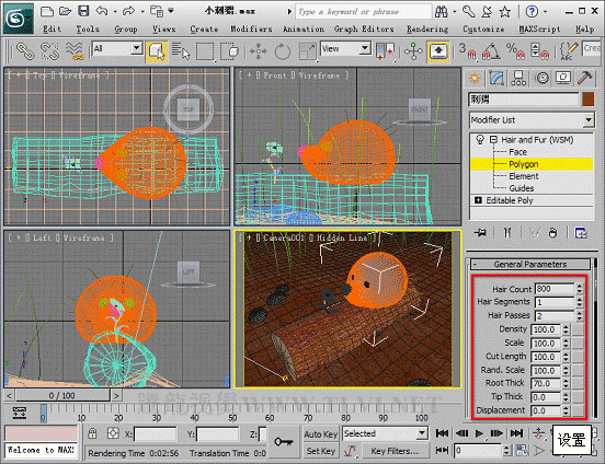 (11)接下來需要設置刺猬身上的刺,首先退出Polygon子對象層,然后在場景中選擇“刺猬”對象,為其添加一個Hair and Fur修改器。