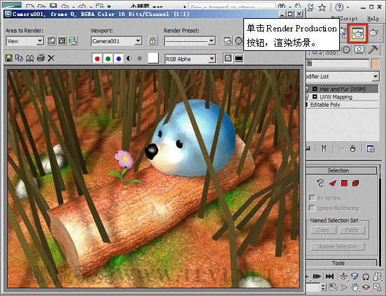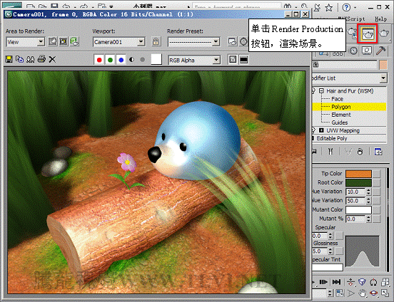 (3)添加Hair and Fur修改器后,對象表面會自動生成毛發,毛發的效果在渲染后才能看到,渲染Cameras001視圖,可以看到毛發效果。