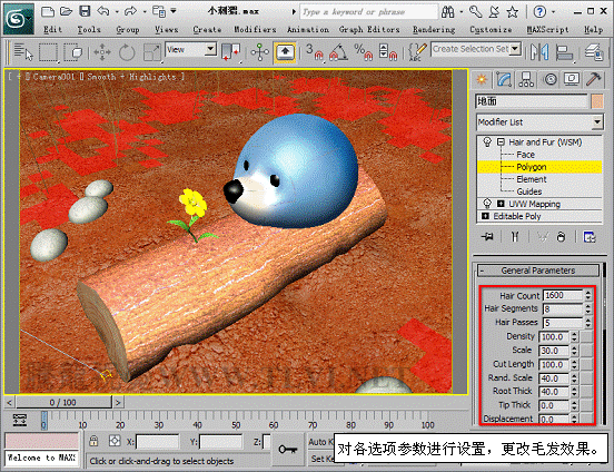(6)在General Parameters卷展欄內別分設置毛發的數量、分段數、剪切長度、根厚度和稍厚度。