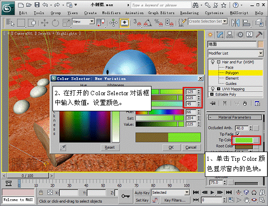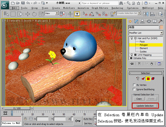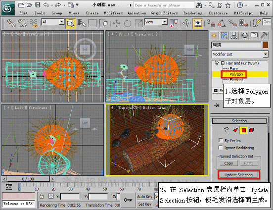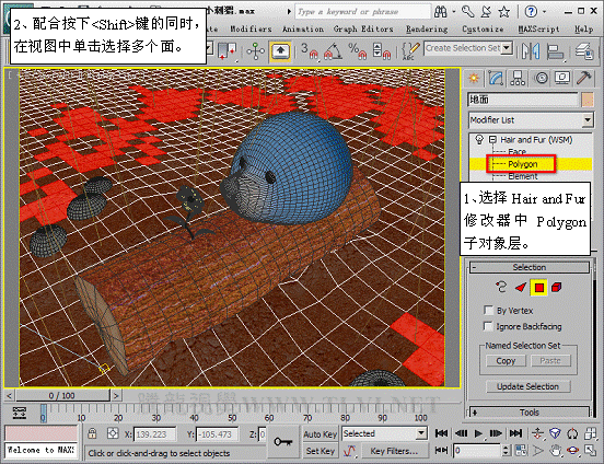 (12)進入Polygon子對象層,并使毛發沿指定面生成。