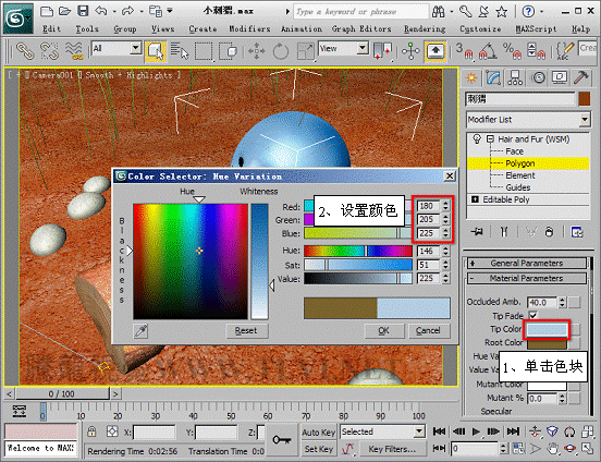 (4)觀察渲染后的圖像可以發現,當前毛發的數量和顏色都不正確,需要對其進行編輯,首先需要選擇子對象,使毛發沿制定面生成。