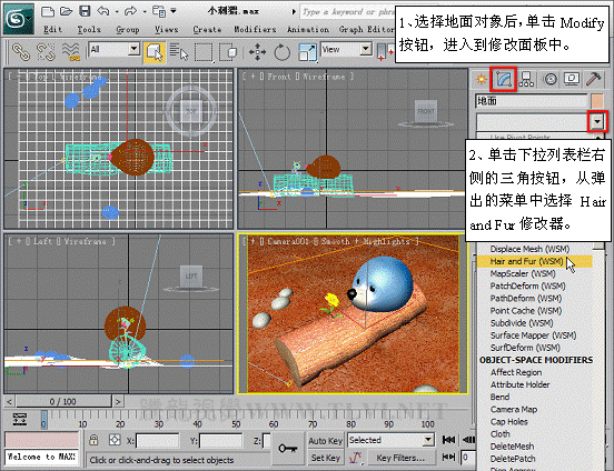 (2)首先需要創建草的效果,在場景中選擇“地面”對象,并為其添加一個Hair and Fur修改器。