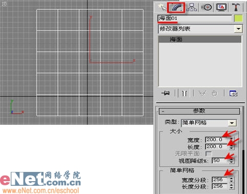 1、啟動3dmax9.0,單擊“創建”命令面板,點擊“幾何體”按鈕,在下拉列表框中選擇“幻景對象”項。點擊“海面”按鈕,在頂部視圖中拖拽出一個海面01,進入它的“修改”命令面板,并調整其尺寸大小,如圖1所示。